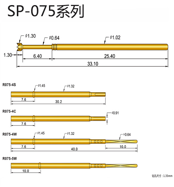 6、SP125探針的探針直徑:2.0mm,總長:33.35mm,頭部直徑:2.5mm,常用的配套有:R125-1S/R125-2S/R125-3S/R125-4S/R125-4W,額定電流:5A,接觸電阻:50毫歐姆,建議鉆孔尺寸:2.4mm。
