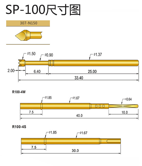 4、SP100探針直徑:1.37mm,總長:33.40mm,常用的配套有R100-4W以及R100-4S,接觸電阻:30毫歐姆。