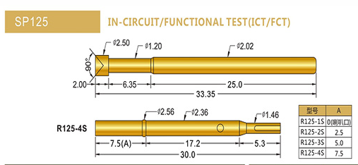 SP125探針的針身直徑:2.0mm,頭部直徑:2.5mm,總長(zhǎng):33.35mm,針管材質(zhì):黃銅鍍金,彈簧材質(zhì):不銹鋼線,鉆孔尺寸:2.4mm,額定電流:5安培,接觸電阻:50毫歐姆,接觸彈力:1N、2N、3N可選,常用的配套有:R125-4S。