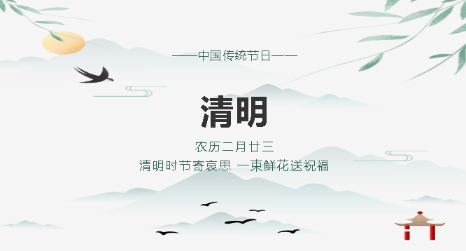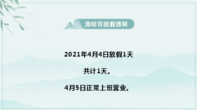 又是一年清明際,又是追思紀念時。清明節是中國的傳統節日之一,它不僅是人們祭奠祖先、緬懷先烈的節日,也是中華民族認祖歸宗的紐帶。華榮華全體員工祝大家萬事順意,平安健康!關于2021年“清明節”放假時間,我司作出以下安排: