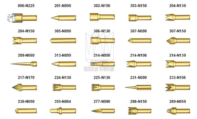 長度33.4mm,直徑1.37mm,行程6.35mm,行程直徑0.9mm,有杯頭,圓頭,平頭,尖頭,梅花頭等多種頭型可供選擇,并且有配套繞線針套R100-4W和焊線針套R100-4S,標準彈力為2N和3N,可接受定制