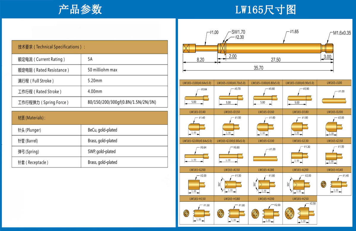 產品介紹:本產品一般用有定向作用的結束測試用,產品選用日本SK4 彈簧選用的是琴鋼線。工廠選用的材質都是比較硬的,有利于在測試的時候過大電流不會容易損壞。